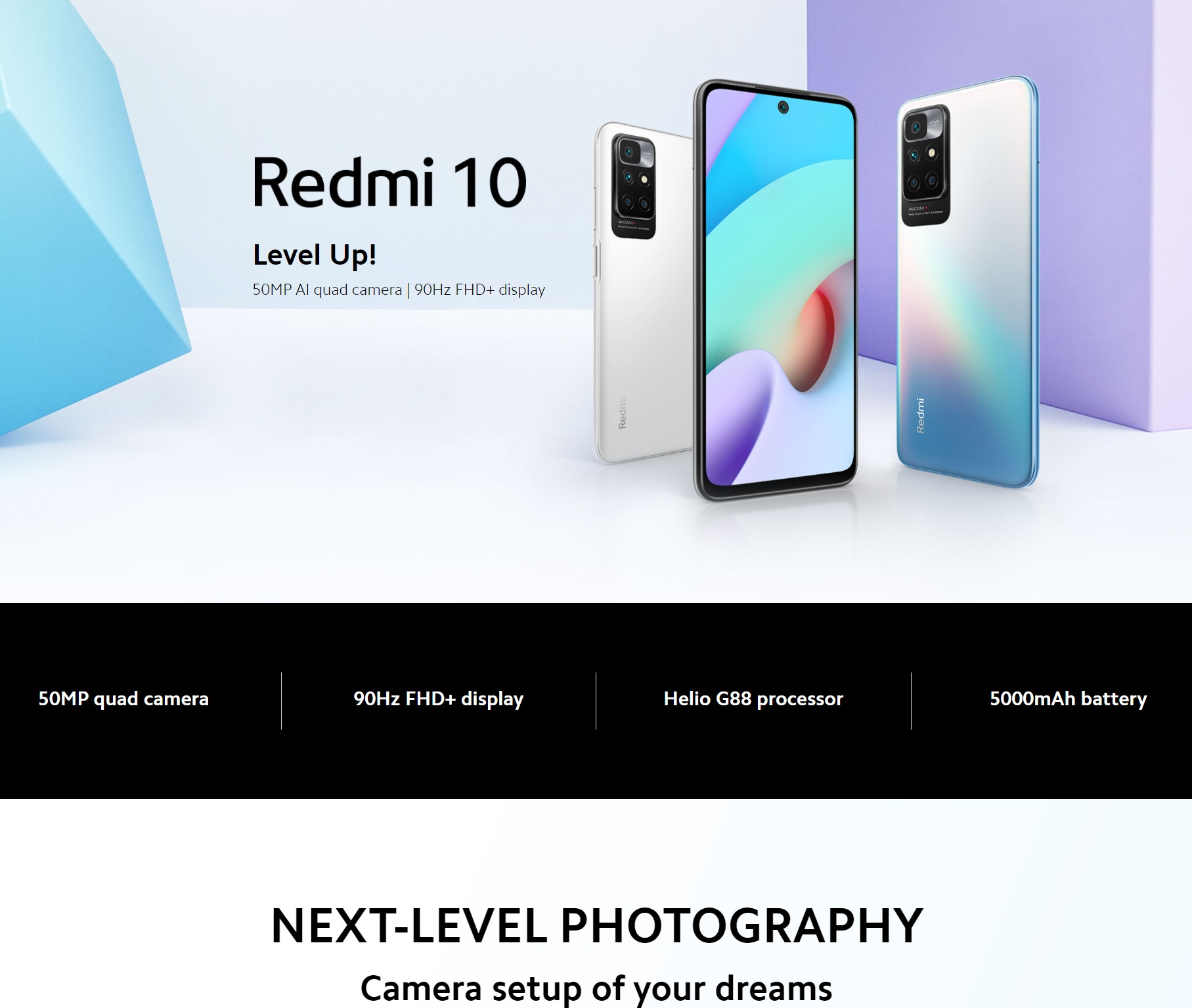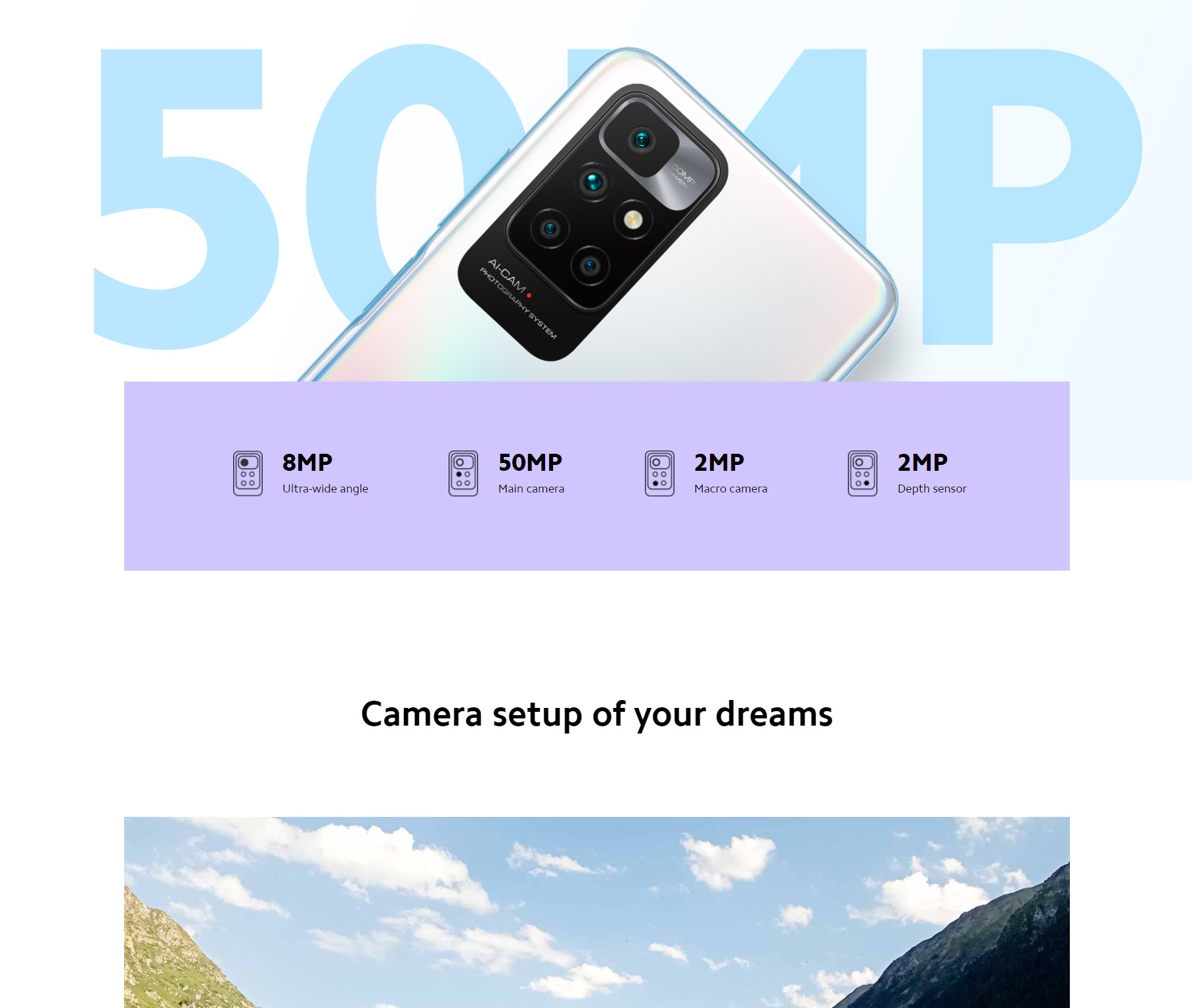 - 50MP AI quad rear camera · 50MP main camera f/1.8 · 8MP ultra-wide angle camera FOV 120° f/2.2 · 2MP macro camera f/2.4 · 2MP depth sensor f/2.4